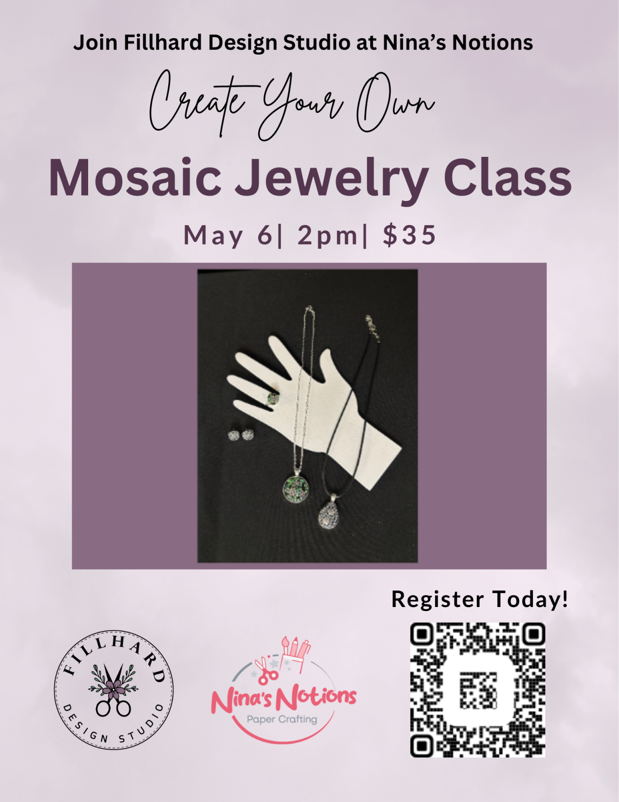 | Materials Included: | All materials to create your custom mosaic jewelry set A choice of pendant, earring, and ring bases Step-by-step instruction and creative guidance — perfect for all skill levels A relaxed, social atmosphere — bring friends or come make new ones! |